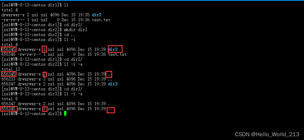当我们在目录中在创建一个目录时, 引用计数就会变为3, 因为目录中还存在一个隐藏文件..表示上一目录, 所以如果一个目录中存在一个目录的话, 引用计数就会变为3, 此时目录文件inode编号与目录名/./..产生关联, 当目录中存在多个目录时, 自然引用计数也会逐渐++