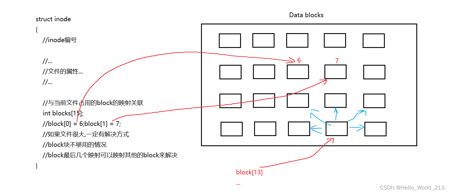 {//inode编号//...//文件的属性...//...//与当前文件占用的block的映射关联int blocks[15];//block[0] = 6;block[1] = 7;//如果文件很大,一定有解决方式//block块不够用的情况//block最后几个映射可以映射其他的block来解决