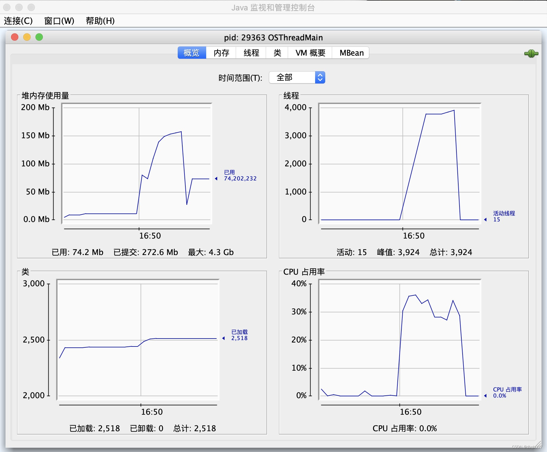 可以看出,整个程序运行过程中,比较突出的资源使用是线程数和CPU占用率,线程数达到了将近4000个线程,并持续了程序运行的大部分有效时间(前面为了能让JConsole能先连接上程序再进行监测,程序首先睡了60秒)。同时CPU的占用率也在程序有效运行时间内保持在30%到40%之间。