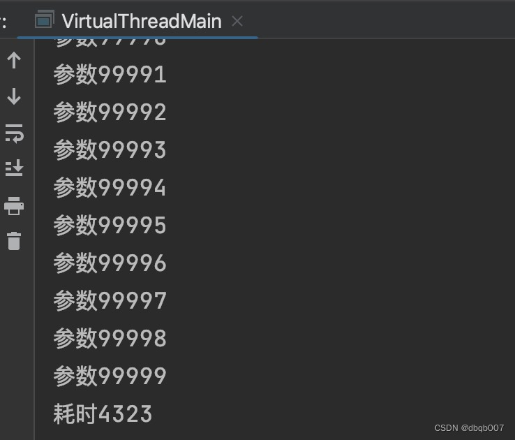 public class VirtualThreadMain {public static void main(String[] args) throws IOException, InterruptedException {TimeUnit.SECONDS.sleep(60);AtomicInteger count = new AtomicInteger();long start = System.currentTimeMillis();try (var executor = Executors.newVirtualThreadPerTaskExecutor()) {IntStream.range(0, 100000).forEach(i -> {executor.submit(() -> {System.out.println("参数" + (count.getAndIncrement()));Thread.sleep(Duration.ofSeconds(1));return i;});});}System.out.println("耗时" + (System.currentTimeMillis() - start));System.in.read();}