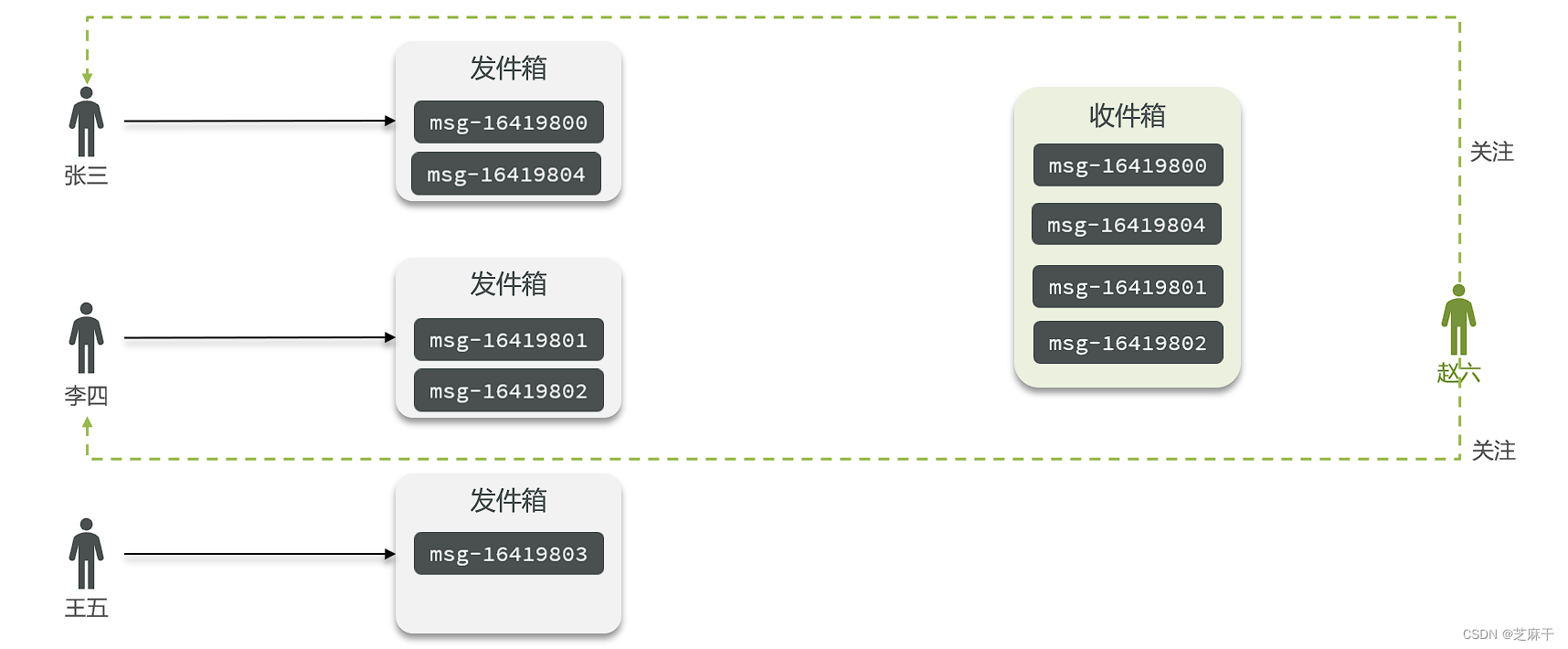 也叫做读扩散。它是每个博主发出博客信息后,都有一个发件箱,这个时候,粉丝要来读它的信息,就从这个发件箱里拉取信息到自己的收件箱中并读取,所以叫拉模式。