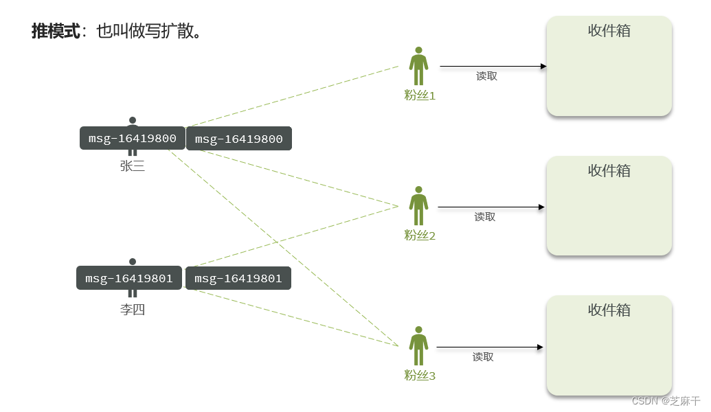 也叫作写扩散。它是一个博主发布博客信息后,直接将博客推送到粉丝的收件箱中。这种方法,解决了拉模式的延迟问题,但也会导致内存问题。