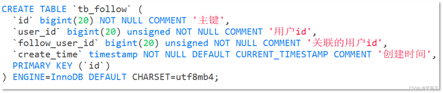 关注是User之间的关系,是博主与粉丝的关系,数据库中有一张tb_follow表来标示: