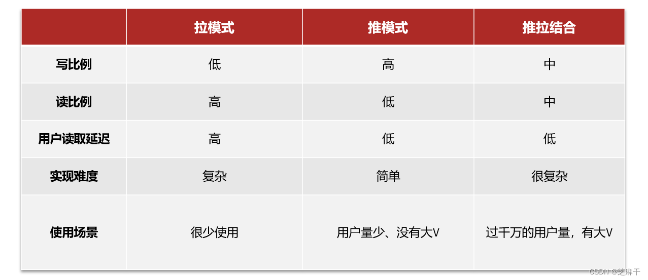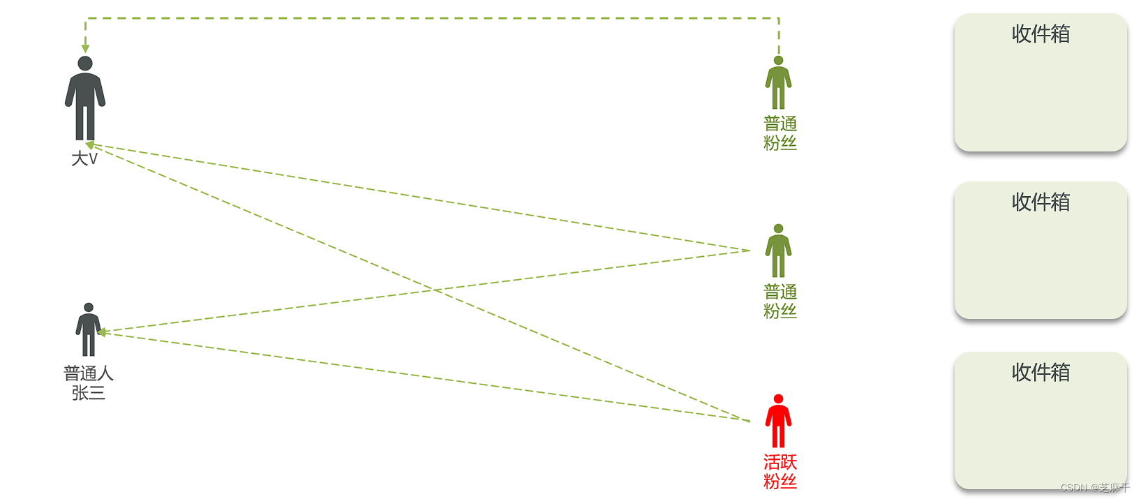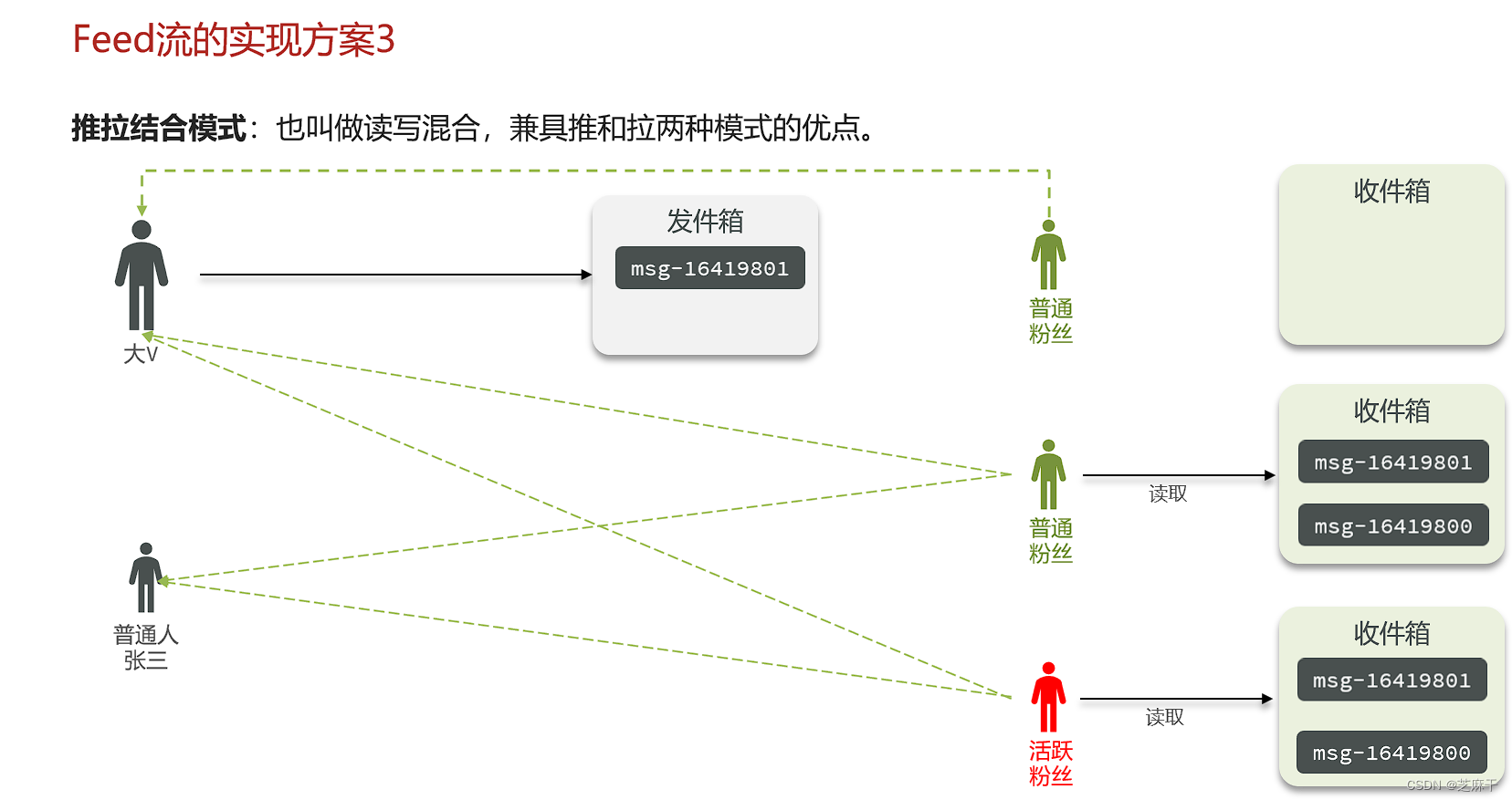 而对于大V博主来说,将粉丝分为活跃粉丝和普通粉丝,活跃粉丝采用推模式,而普通粉丝采用拉模式,将消息放进收件箱中。