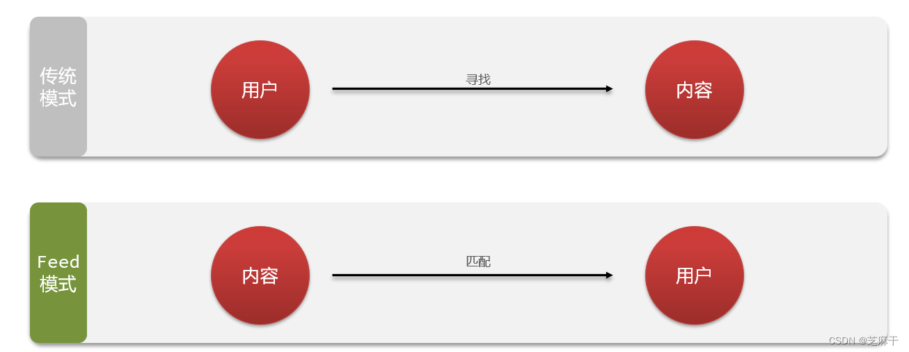 传统的推送模式是用户自己查找内容,而Feed这是根据内容信息来取查找对应用户并推送