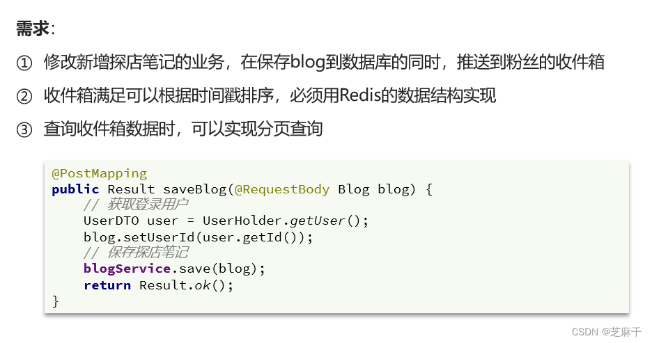 @Overridepublic Result saveBlog(Blog blog) {// 获取登录用户UserDTO user = UserHolder.getUser();blog.setUserId(user.getId());// 保存探店博文boolean isSuccess = save(blog);if (!isSuccess){//没有保存成功,返回错误信息return Result.fail("新增失败!");}//成功,将博客信息放到粉丝收件箱//1.先获取粉丝群体 select * from tb_follow where follow_user_id = ?QueryChainWrapper follows = followService.query().eq("follow_user_id", user.getId());//2.将消息推送至粉丝收件箱String key = "feeds:"+user.getId();stringRedisTemplate.opsForZSet().add(key,blog.getId().toString(),System.currentTimeMillis());// 返回idreturn Result.ok(blog.getId());}