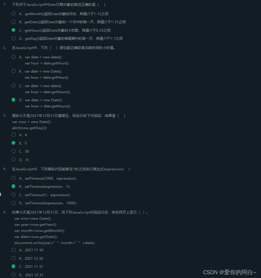 假如今天是2021年12月31日星期五,则运行如下代码后,结果是(B ) var now = new Date(); alert(now.getDay());
