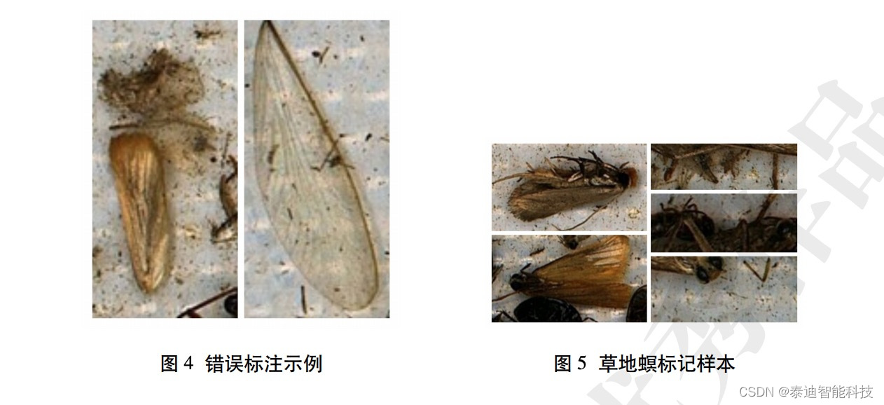 通过 python 调用 opencv 库,我们对所给出的标注图片中昆虫的具体图像做了分 离,可以发现给出的标注图像中,很多图片标注中出现了标注不准确的问题,如图 4中 中一只翅膀分别被标记为了稻螟蛉和紫条尺蛾,而图 5中对于草地螟所有通过标记给 出的五张图片中,只有一张能够完整的表示出草地螟的完整生物学特征。