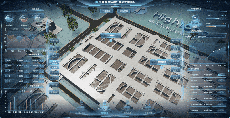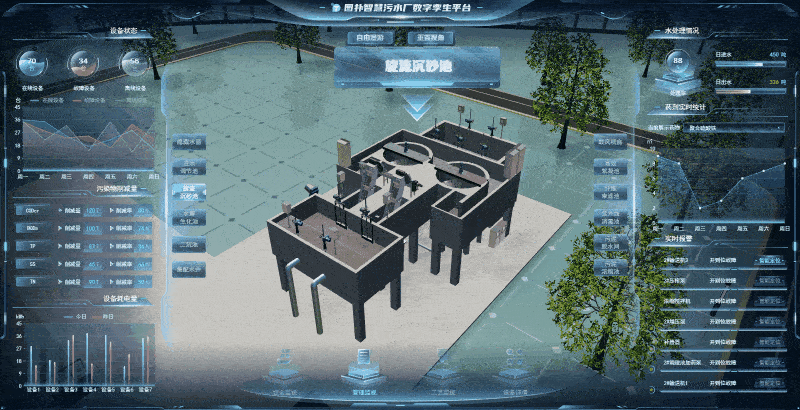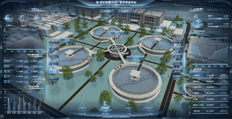 基于 Web 3D 开发技术搭建的净水系统虚拟漫游巡检,将污水厂中的各种设备、零部件、传感器及数据信息进行原比例 3D 建模渲染还原,实时加载净水设备运维数据,模拟现实世界污水厂的设备运行状态。