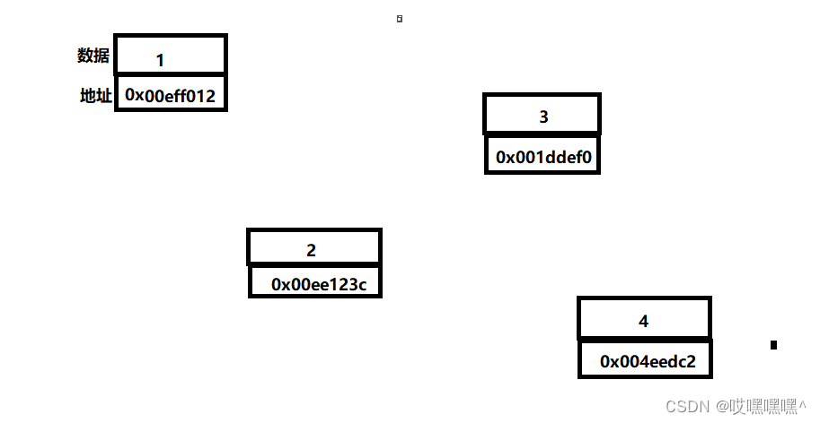 上图说明数据元素是分散在内存的各个位置的。因此也就无法在通过顺序存储的方式去表示各个元素之间的关系了。那现在就有问题了,所谓的数据结构不仅要有数据还要求数据之间要能联系起来,现在如何来关联各个元素之间的关系呢?