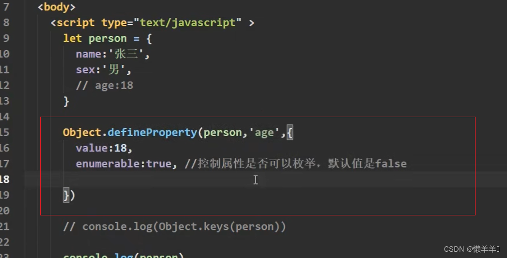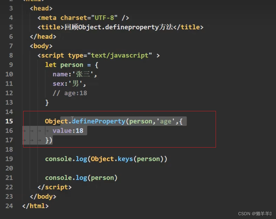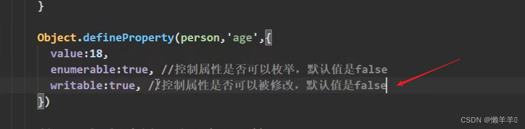 defineProperty方法的第一个参数表示需要给哪个对象添加属性,第二个参数添加的属性叫什么名,第三个配置项,配置项里可以写很多的配置,比较常用的如:value
