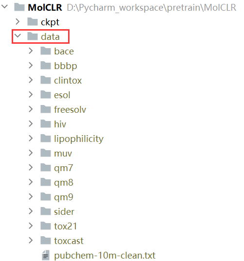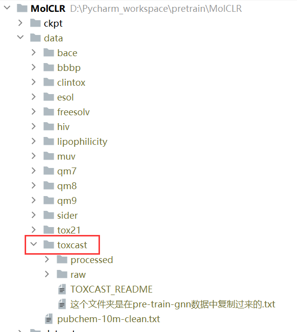 【只要它的数据处理部分】:这里直接把下载的数据的toxcast文件夹复制到MoLClR的data下面就行了