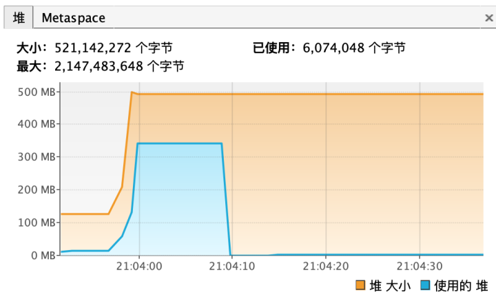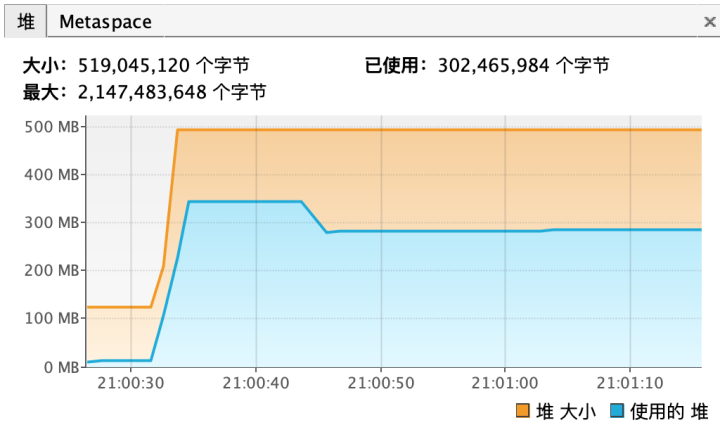 先使用jstat命令统计垃圾回收,间隔时间500毫秒打印一次。根据一个Integer对象占用16字节,每1秒钟向list添加100000个整数,16*100000字节大约是1.5M,与统计图eden区平均每秒产生对象的大小接近。 再观察jvisualvm中堆内存的曲线图,每分钟平均生产100M对象,数据相符合。