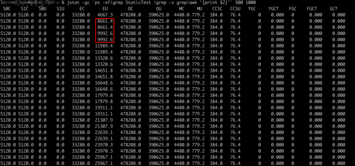 jstat -gc `jps|grep StaticTest |grep -v grep|awk '{print $1}'` 500 1000