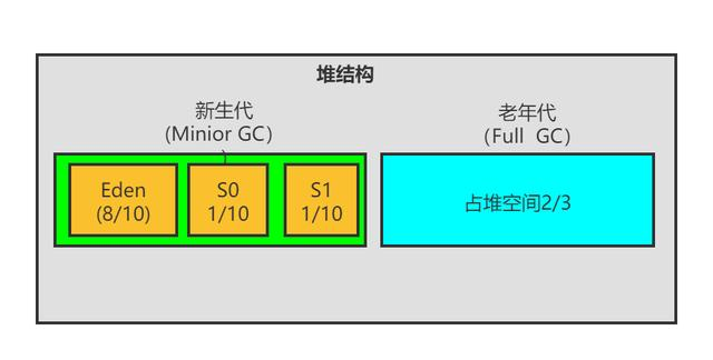 大量的对象在Eden区分配,YoungGC之后存活的对象经过S0、S1,大对象与长期存活的对象可能会到Old区。Eden与Survivor区默认8:1:1。