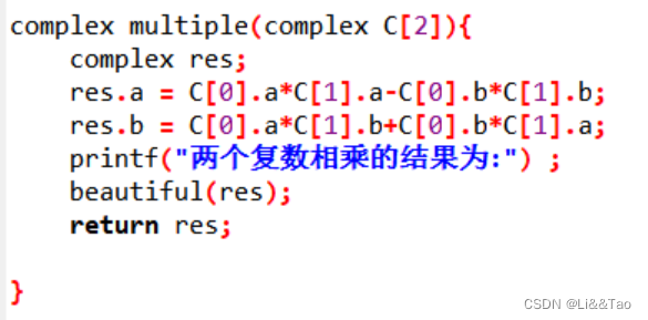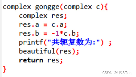 } complex multiple(complex C[2]){complex res;res.a = C[0].a*C[1].a-C[0].b*C[1].b;res.b = C[0].a*C[1].b+C[0].b*C[1].a;printf("两个复数相乘的结果为:") ;beautiful(res); return res;}complex gongge(complex c){complex res;res.a = c.a;res.b = -1*c.b;printf("共轭复数为:") ;beautiful(res); return res;