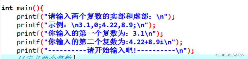 // printf("%lf,%lf,%lf,%lf",C[0].a,C[0].b,C[1].a,C[1].b);//这一行的主要目的是检验输入的数据是不是符合要求的。 sum(C);//两个复数求和mins(C);//两个复数求差multiple(C);//两个复数求积//分离出两个实部 real(C[0]);real(C[1]);//分离出两个虚部virtuals(C[0]);virtuals(C[1]);//求出两个复数的共轭gongge(C[0]);gongge(C[1]);//两个复数相除divide(C);return 0;}