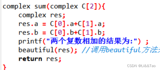 } complex sum(complex C[2]){complex res;res.a = C[0].a+C[1].a;res.b = C[0].b+C[1].b;printf("两个复数相加的结果为:") ;beautiful(res); //调用beautiful方法来实现复数的标准输出,一下方法同理 return res;