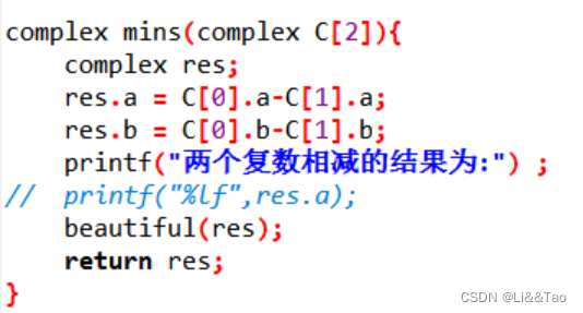 } complex mins(complex C[2]){complex res;res.a = C[0].a-C[1].a;res.b = C[0].b-C[1].b;printf("两个复数相减的结果为:") ;