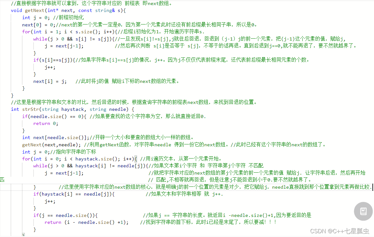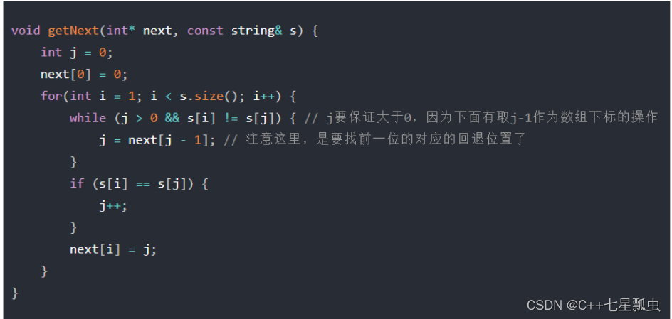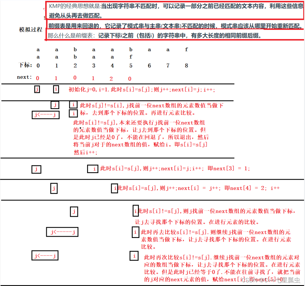 题目解析:利用字符串就能得到 这个字符串的前缀表next数组,然后再进行文本 和 字符串 匹配 的过程中,一旦发现字符串元素和文本的元素不匹配,此时在next数组里面查找,字符串此时应该回退到那个位置,而不像暴力法一样,要重头开始匹配。KMP更节省时间。