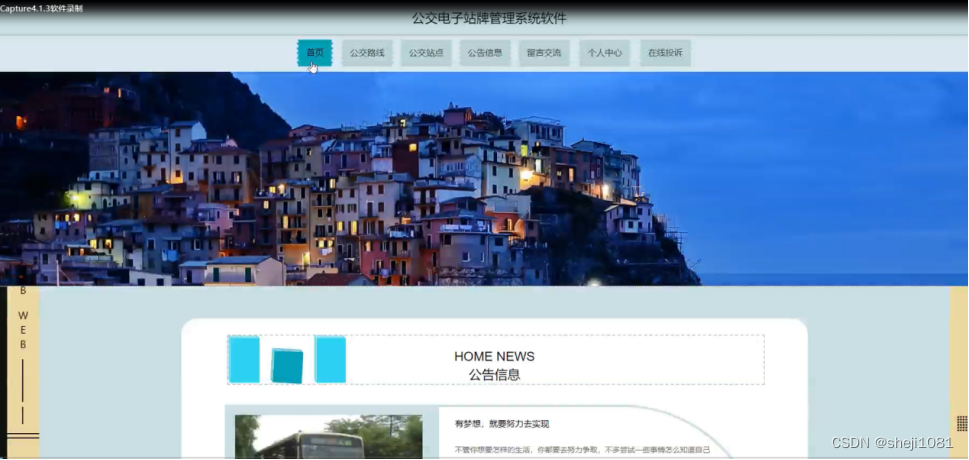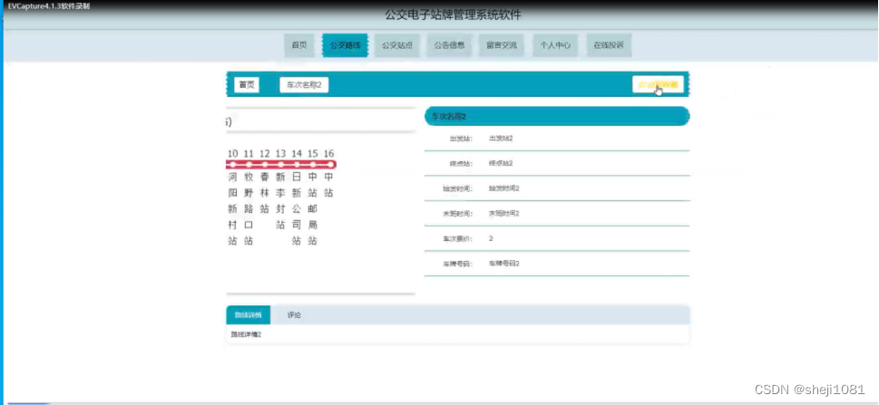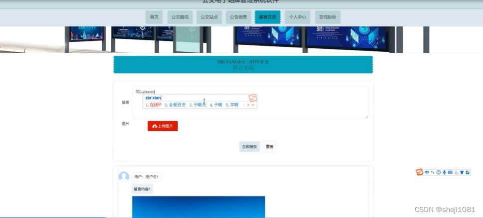公交电子站牌管理系统,在系统首页可以查看首页、公交路线、公交站点、公告信息、留言交流、个人中心、在线投诉等内容,并进行详细操作;如图5-1所示。