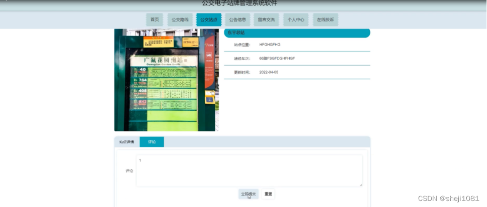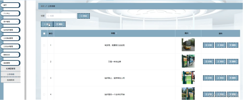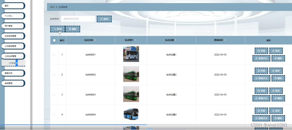公交站点管理,在公交站点管理页面可以对索引、站点名称、 站点图片、站点位置、更新时间等内容进行详情、修改、查看评论或删除等操作,如图5-12所示。
