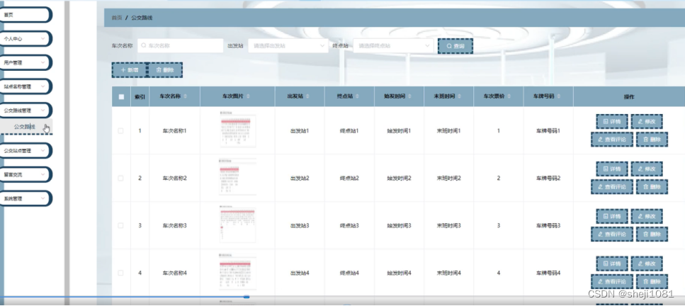 公交路线管理,在公交路线管理页面可以对索车次名称、车次图片、 出发站、终点站、始发时间、未班时间、车次票价、车牌号码等内容进行详情、修改、查看评论或删除等操作,如图5-11所示。