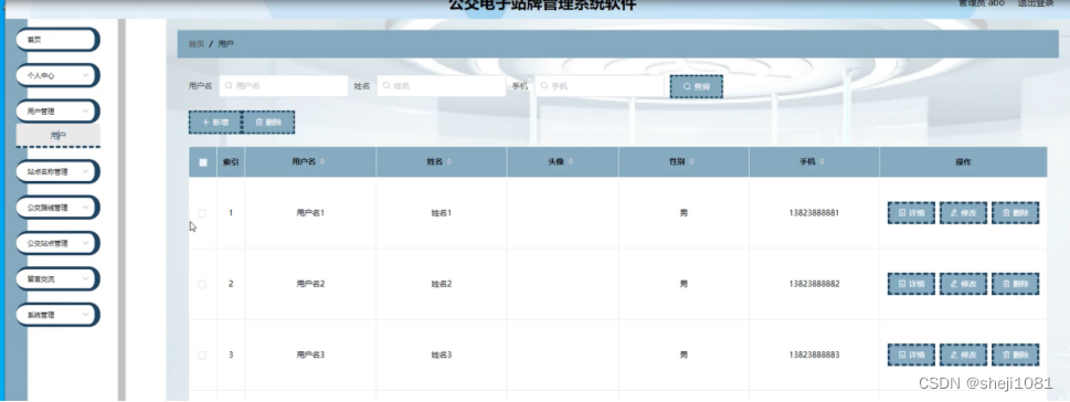 用户管理,在用户管理页面可以对索引、用户名、姓名、头像、性别、手机等内容进行详情、修改或删除等操作,如图5-9所示。