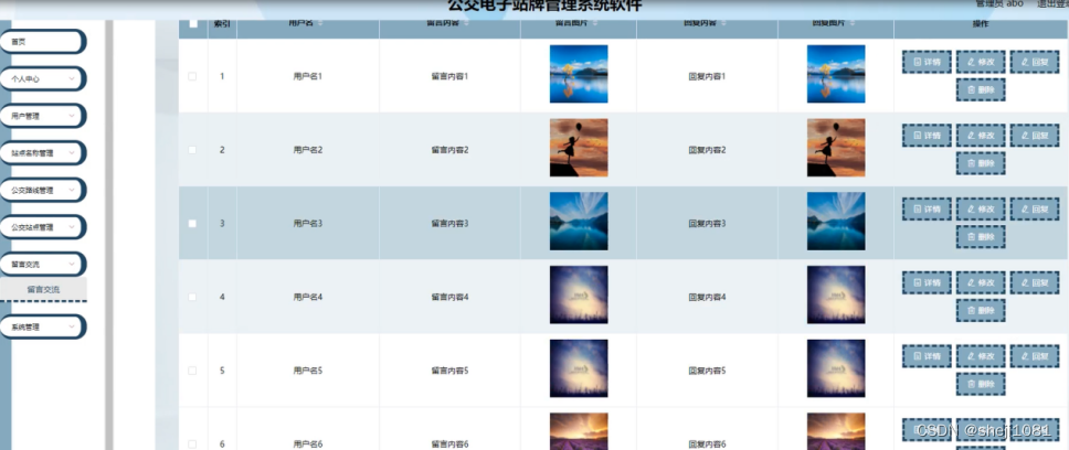 留言交流,在留言交流页面可以对索引、用户名、留言内容、留言图片、回复内容、回复图片等内容进行详情、修改、回复或删除等操作;如图5-13所示。