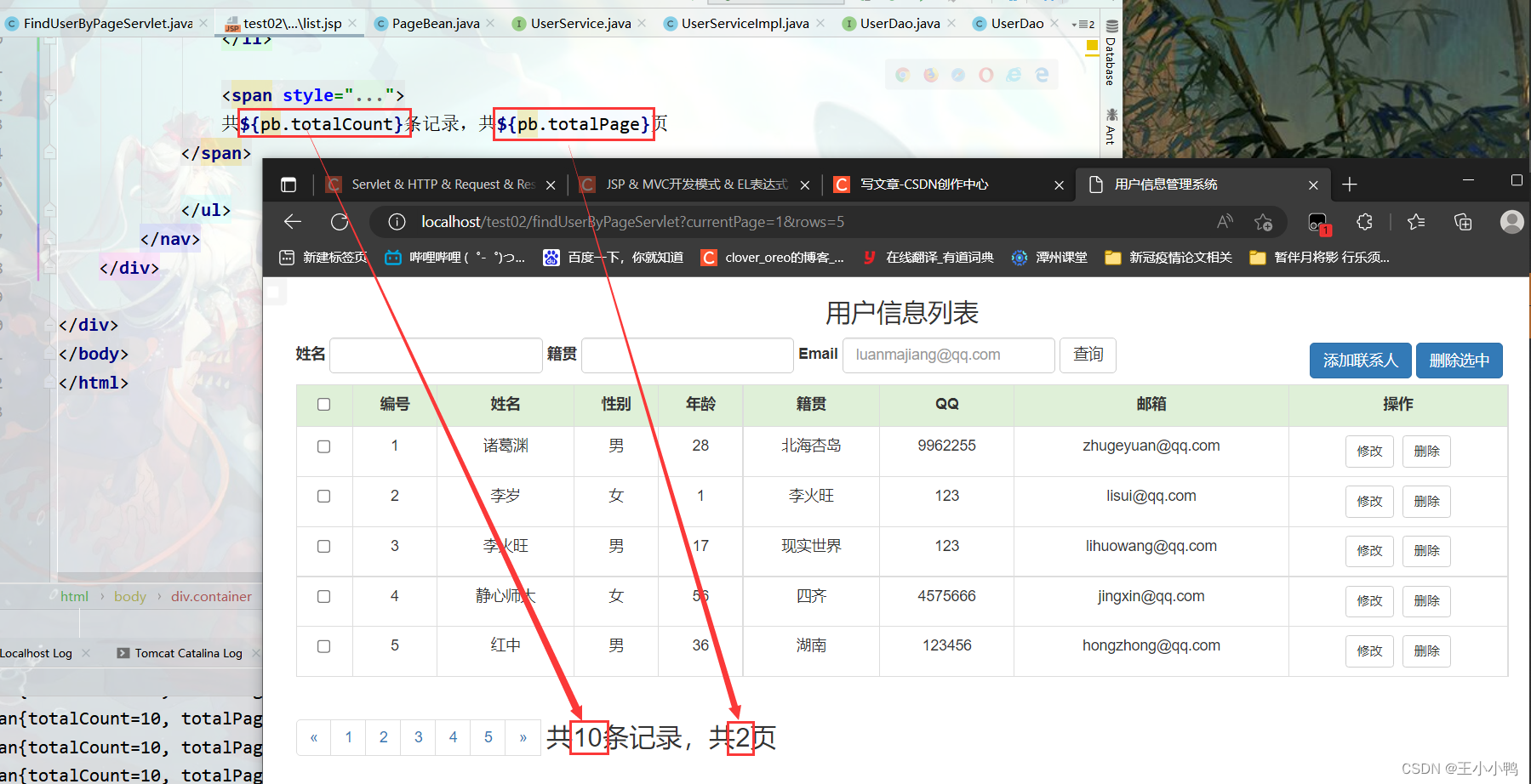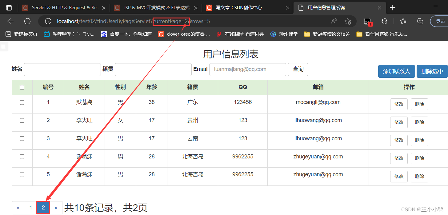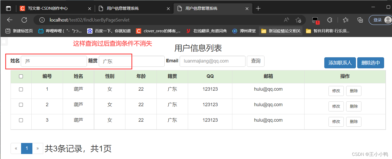 //1.设置编码request.setCharacterEncoding("utf-8");//2.获取参数Mapmap = request.getParameterMap();//3.封装对象User user = new User();try {BeanUtils.populate(user,map);} catch (IllegalAccessException e) {e.printStackTrace();} catch (InvocationTargetException e) {e.printStackTrace();}//4.调用service方法报错UserService service = new UserServiceImpl();service.addUser(user);//5.跳转到/userListServlet // 没有共享数据使用重定向 加上虚拟路径request.getContextPath()response.sendRedirect(request.getContextPath()+"/userListServlet"); UserDaoImpl中的addUser方法也优化了@Overridepublic User addUser(User user) {try {//第一版 //String sql = "insert into user2 set name = ?, gender = ?, age = ?, address = ?, qq= ?, email = ?";//第二版String sql ="insert into user2 values(null, ?, ?, ?, ?, ?, ?,null, null )";template.update(sql, user.getName(), user.getGender(), user.getAge(), user.getAddress(), user.getQq(), user.getEmail());} catch (DataAccessException e) {e.printStackTrace();}return user;}添加用户成功!