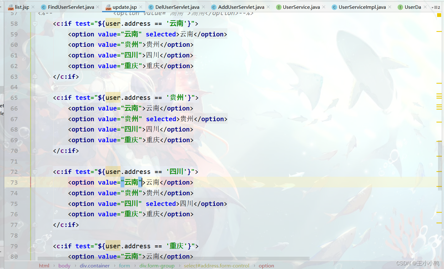 之前的修改性别和地址不知道默认值,所以要判断选择框里的性别和籍贯,需要在update.jsp开头加上标签引入
