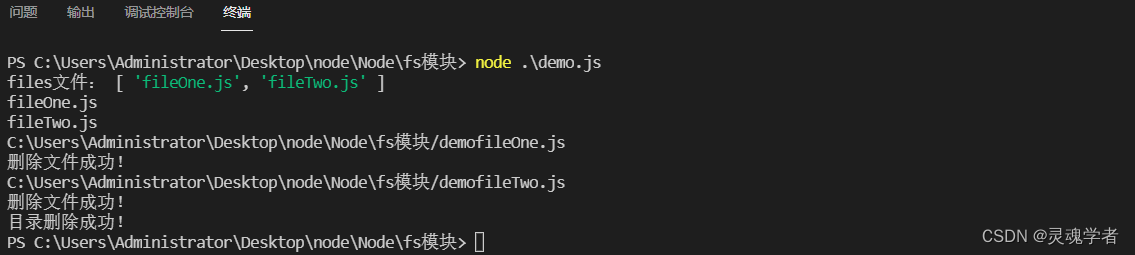 fs.readdir(__dirname + '/demo',function(err,files){if(err) throw err;console.log("files文件:",files);// 删除文件files.forEach(function(file){console.log(file);fs.unlink(__dirname+'/demo/'+file,function(err){console.log(__dirname+'/demo'+file);if(err){return console.log("删除文件失败!");}console.log("删除文件成功!");})})// 删除目录fs.rmdir(__dirname+'/demo',function(err){if(err){return console.log("目录删除失败!");}console.log("目录删除成功!");})
