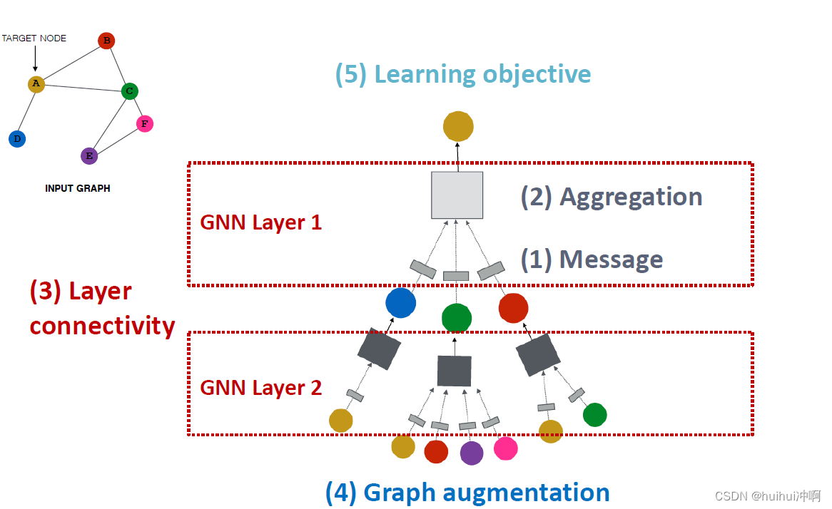 包含两部分: Message(节点嵌入的转换)与Aggregation(聚合来自不同节点的message)