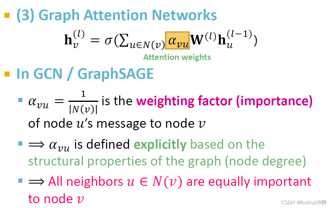 在GCN与GraphSAGE中,权重因子,是基于图的结构特性(node degree)决定的,所有节点v的邻居节点u都有相同的重要性。