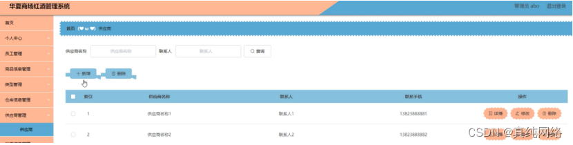 供应商管理,在供应商管理页面查看索引,供应商名称,联系人,联系手机等详细内容,根据需要进行详情,修改和删除等操作,如图5-5所示。