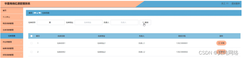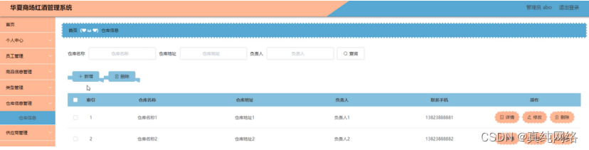 仓库信息管理,在仓库信息管理页面查看索引,仓库名称,仓库地址,负责人,联系手机等详细内容,根据需要进行详情,修改和删除等操作,如图5-4所示。