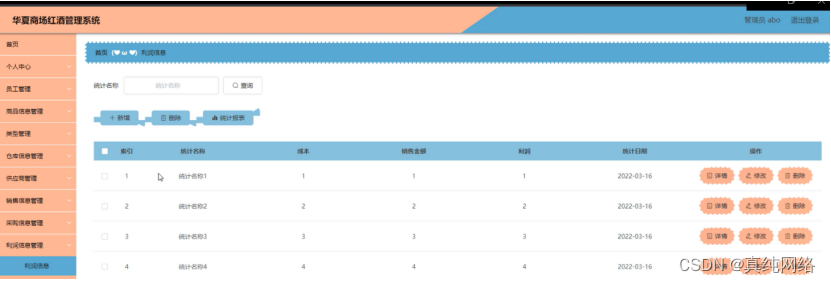 利润信息管理,在利润信息管理页面可以对索引,统计名称,成本,销售金额,利润,统计日期等内容进行详情查看和删除操作,如图5-8所示。