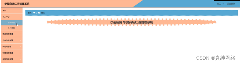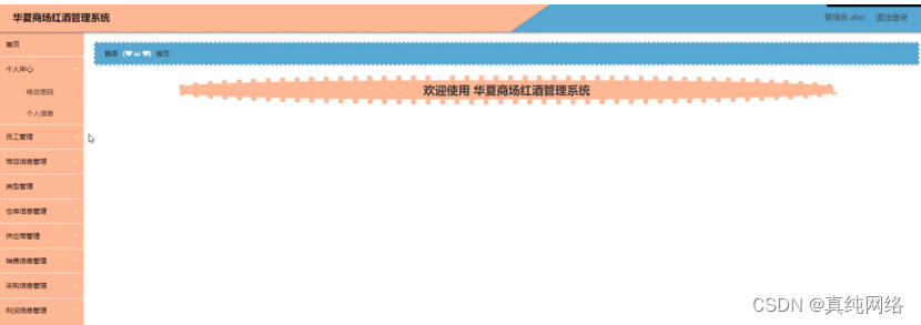 华夏商场红酒管理系统,在管理员首页可以查看首页,个人中心,员工管理,商品信息管理,类型管理,仓库信息管理,供应商管理,销售信息管理,采购信息管理,利润信息管理等内容进行详细操作,如图5-1所示。