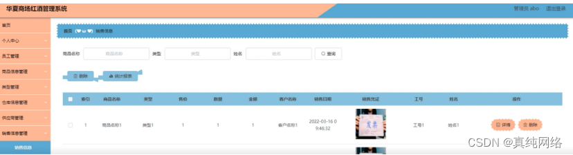 销售信息管理,在销售信息管理页面查看索引,商品名称,类型,售价,数量,金额,客户名称,销售日期,销售凭证,工号,姓名等内容根据需要进行详情,修改和删除等操作,如图5-6所示。