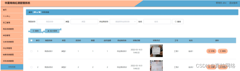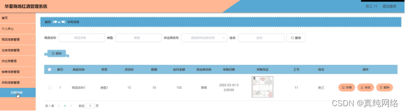 采购信息管理,在采购信息管理页面可以对:索引,商品名称,类型,进货价,数量,应付金额,供应商名称,采购日期,采购凭证,工号,姓名等内容进行详情查看和删除操作,如图5-7所示。