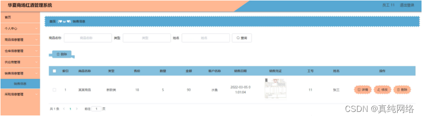 销售信息管理,在销售信息管理页面查看索引,商品名称,类型,售价,数量,金额,客户名称,销售日期,销售凭证,工号,姓名等内容根据需要进行详情,修改和删除等操作,如图5-13所示。