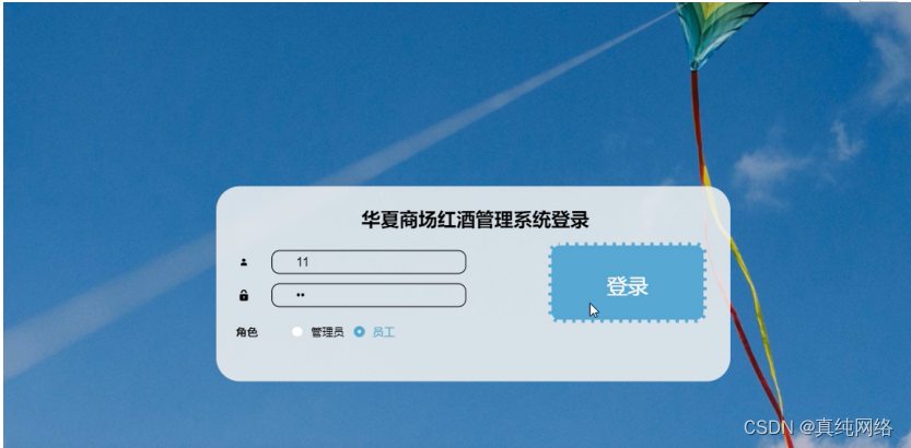员工进行登录,进入系统前在登录页面根据要求填写用户名、密码,选择角色等信息,点击登录进行登录操作,如图5-9所示。