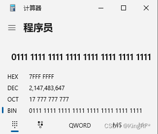 一个int数据类型占4个字节,就是32位,当有符号变量时,32位中的最高位通过1或0代表这个数据是正数还是负数,所以有符号数据的数据位是31位,所以最大值是 2147483647;