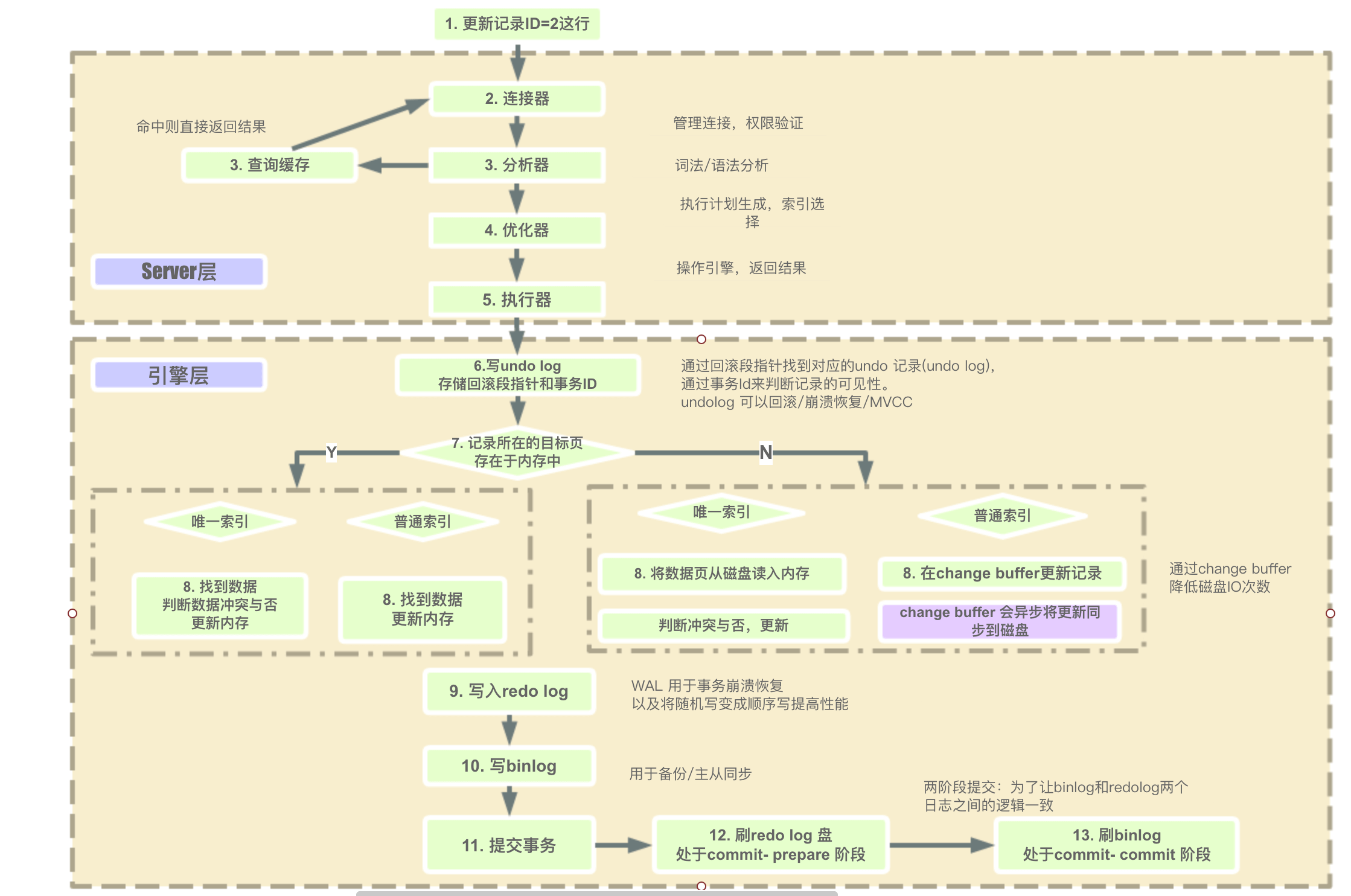 更新时,先改内存中的数据页,将更新操作写入redo log日志,此时redo log进入prepare状态,然后通知MySQL Server执行完了,随时可以提交,MySQL Server将更新的SQL写入bin log,然后调用innodb引擎接口将redo log设置为提交状态,更新完成。