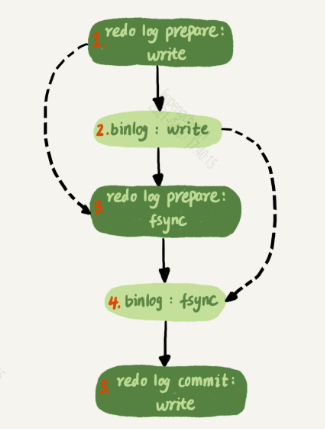 在双一模式下的流程,每个事务提交时都需要进行fsync刷盘,其执行过程才如上图所示。然而在配合两个参数sync_binlog和innodb_flush_log_at_trx_commit,上图会有所调整。