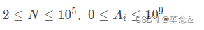 3)定理:带余除法。如果a和b为整数且b>0,则存在唯一的整数 q、r,使a=bq+r,0 整数 a 和6的最大公约数是指能同时整除a 和b 的最大整数,记为 gcd(a,b)。 例如:gcd(15,81)=3,gcd(0,44)=44,gd(0,0)=0,ged(-6,-15)=3,ged(-17,289)=17。 注意:由于-a 的因子和a 的因子相同,因此 ged(a,b)=ged(lal,lbl)。编码时只需要关注正整数的最大公约数。 1) gcd(a,b)=gcd(a,a+b)=gcd(a, ka+b) 2) gcd(ka,kb)=k*gcd(a, b)。 3) 定义多个整数的最大公约数: gcd(a,b,c)=gcd[gcd(a,b),c]。 4)若 gcd(a,b)=d,则 gcd(a/d,b/d)=1,即a/d 与b/d 互素。 5) gcd(a+cb,b)=gcd(a,b). 辗转相除法原理:用较小数除较大数,再用出现的余数(第一余数)去除除数,再用出现的余数(第二余数)去除第一余数,如此反复,直到最后余数是0为止。如果是求两个数的最大公约数,那么最后的除数就是这两个数的最大公约数。这个和更相减损术有着异曲同工之处。 用辗转相除法求 GCD 即 gcd(a,b)=gcd(b,a mod b)。代码如下 这是最常用的方法,它极为高效 拉梅定理给出了复杂度分析 拉梅定理:用欧几里得算法计算两个正整数的最大公约数,需要的除法次数不会超过两个整数中较小的那个十进制数的位数的 5 倍。 推论:用欧几里得算法求 gcd(a,b),a>b,需要 O((loga)3)次位运算。 欧几里得算法的缺点是需要做取模运算,而高精度的除法取模比较耗时,此时可以使用“更相减损术 和 Stein 算法,它们只用到了减法和移位操作。 定义:(如果需要对分数进行约分,那么)可以折半的话,就折半(也就是用2来约分)。如果不可以折半的话,那么就比较分母和分子的大小,用大数减去小数,互相减来减去,一直到减数与差相等为止,用这个相等的数字来约分。 算法的计算基于这一性质: gcd(a,b)=gcd(b,a-b)=gcd(a,a-b)。计算步骤:用较大的数减较小的 数,把所得的差与较小的数比较,然后继续做减法操作,直到减数与差相等为止。 更相减损术虽然避免了欧几里得的取模计算,但是计算次数比欧几里得算法多很多,极端情况下需 要计算 O(max(a,b))次,如a=100,b=1时,需计算 100次 Stein 算法是更相减损术的改进。求 gcd(a,b)时,可以分为几种情况进行优化。 (1)a 和b 都是偶数。gcd(a,b)=2gcd(a/2,b/2),计算减半。 (2)a 奇b偶。根据原理:若k和y互为质数有 gcd(kx,y)=gcd(x,b)。当k=2,b 为奇数时,有 gcd(a,b)=gcd(a/2,b),即偶数减半。表示 bb 存在2这个因子而 aa 不存在,则将 bb 除以2,,不考虑因子2; (3)a 偶b奇。gcd(a,b)=gcd(a,b/2), (4)a 和b 都是奇数。gcd(a,b)=gcd((a+b)/2,(a-b)/2)。 算法的结束条件仍然是 gcd(a,a)=a。 除 2 操作用移位就可以了,所以 Stein 算法只用到加减法和移位; a 和b 的最小公倍数表示为 lcm(a,b),从算术基本定理推理得到。 算术基本定理:任何大于1的正整 数n 都可以唯一分解为有限个的乘积; 可以推出 gcd(a,b)lcm(a,b)=ab,即 lcm(a,b)=ab/gcd(a,b)=a/gcd(a,b)b。 注意,要先作除法再作乘法,如果先作乘法可能会溢出。 裴蜀定理是关于 GCD的一个定理。 裴蜀定理(Bezout’s Lemma):如果a 与b 均为整数,则有整数x和y使ax+by=gcd(a,b)。 这个等式称为Bezout 等式 推论:整数a 与b互素当且仅当存在整数 x和y,使ax+by=1. 裴蜀定理很容易证明。 可以这样理解裴蜀定理:对任意x和y, d =ax+by,d 一定是gcd(a,b)的整数倍;最小的 d 是 gcd(a,b). 代码 数学老师给小明出了一道等差数列求和的题目。但是粗心的小明忘记了一 部分的数列,只记得其中 NN 个整数。 现在给出这 NN 个整数,小明想知道包含这 NN 个整数的最短的等差数列有几项? 输入描述 输入的第一行包含一个整数 NN。 第二行包含 NN 个整数 A_1,A_2,··· ,A_NA1,A2,⋅⋅⋅,AN。(注意 A_1A1 ∼ A_NAN 并不一定是按等差数列中的顺序给出) 其中, 输出描述 输出一个整数表示答案。 输入输出样例 示例 样例说明: 包含 2、6、4、10、20 的最短的等差数列是 2、4、6、8、10、12、14、16、 18、20。 代码: 上述代码运行发现可以通过给出的样例,但其实是不对的。 代码: 二 GCD