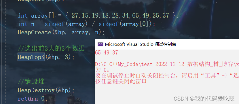 {//定义Heap hp;//初始化HeapInit(&hp);int array[] = { 27,15,19,18,28,34,65,49,25,37 };int n = sizeof(array) / sizeof(array[0]);HeapCreate(&hp, array, n);//选出前3大的3个数据HeapTopK(&hp, 3);//销毁堆HeapDestroy(&hp);return 0;