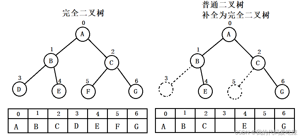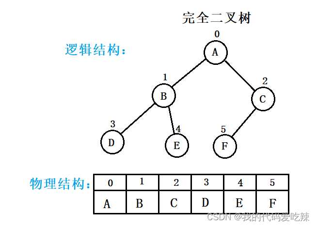 顺序结构存储就是使用数组来存储,一般使用数组只适合表示完全二叉树,因为不是完全二叉树会有空间的浪费。而现实中使用中只有堆才会使用数组来存储,关于堆我们后面的章节会专门讲解。二叉树顺序存储在物理上是一个数组,在逻辑上是一颗二叉树。