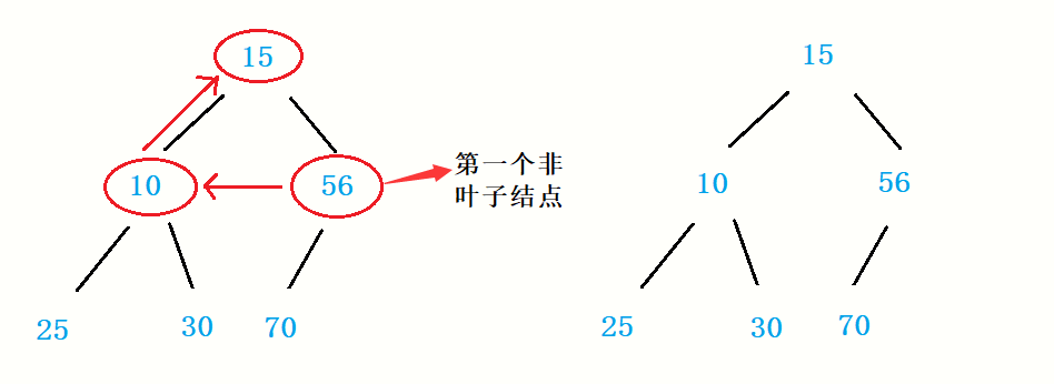 从第一个不为叶子的结点开始,一次往前都进行向下调整,最后得到的就是堆。
