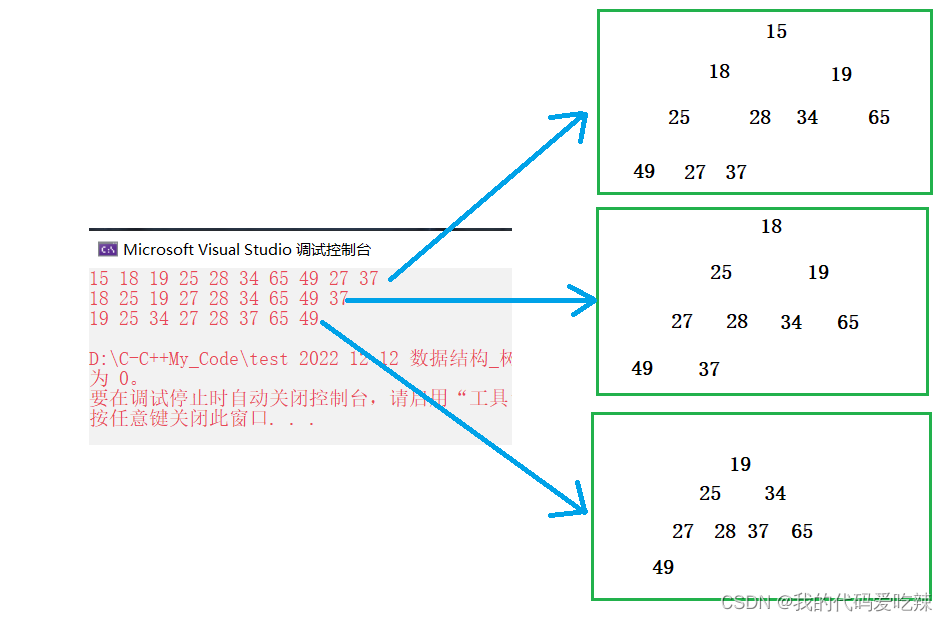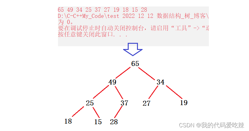 {//定义Heap hp;//初始化HeapInit(&hp);int array[] = { 27,15,19,18,28,34,65,49,25,37 };int n = sizeof(array) / sizeof(array[0]);HeapCreate(&hp, array, n);//打印堆的内容Print(&hp);//销毁堆HeapDestroy(&hp);return 0;